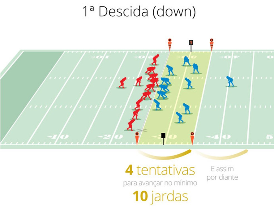 Essa é a dinâmica principal. Para avançar no campo, o time tem posse de bola e 4 tentativas (Downs) para conquistar no mínimo 10 jardas.