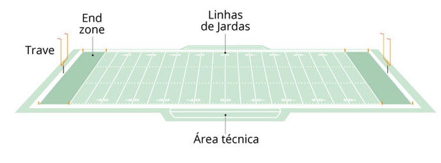 O Campo: Tem 120 jardas de comprimento (aprox. 110 metros). O campo é todo marcado com linhas a cada 5 jardas para medir o avanço.